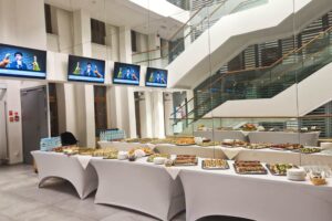 Catering konferencyjny – elegancki stół z przekąskami, wodą i sokami przygotowany na spotkanie biznesowe lub szkolenie