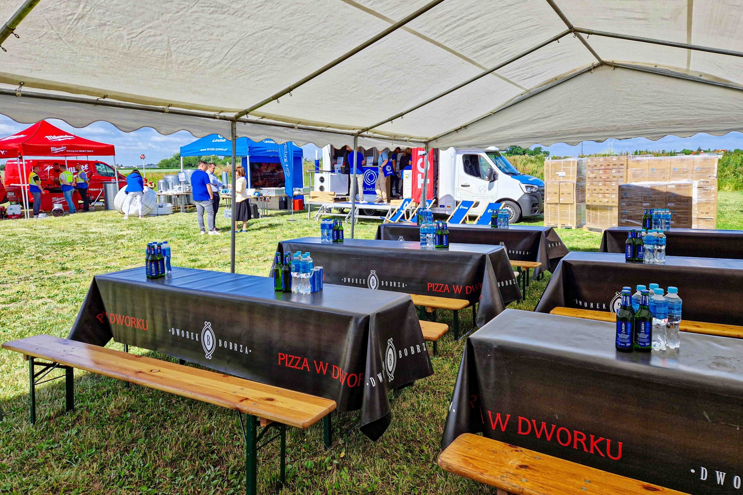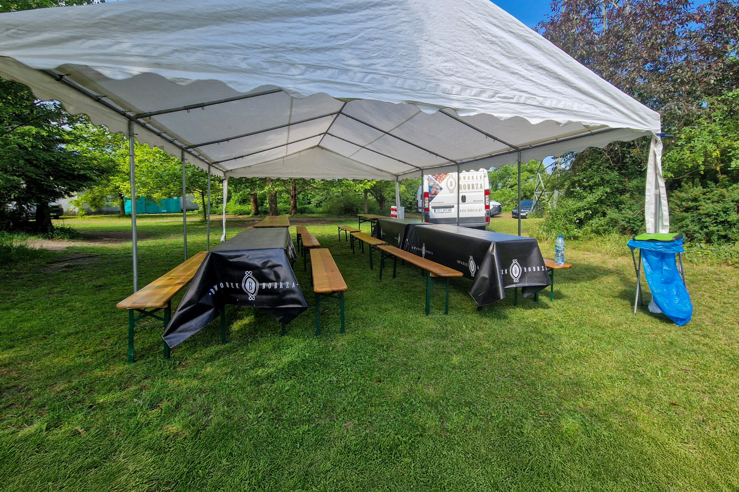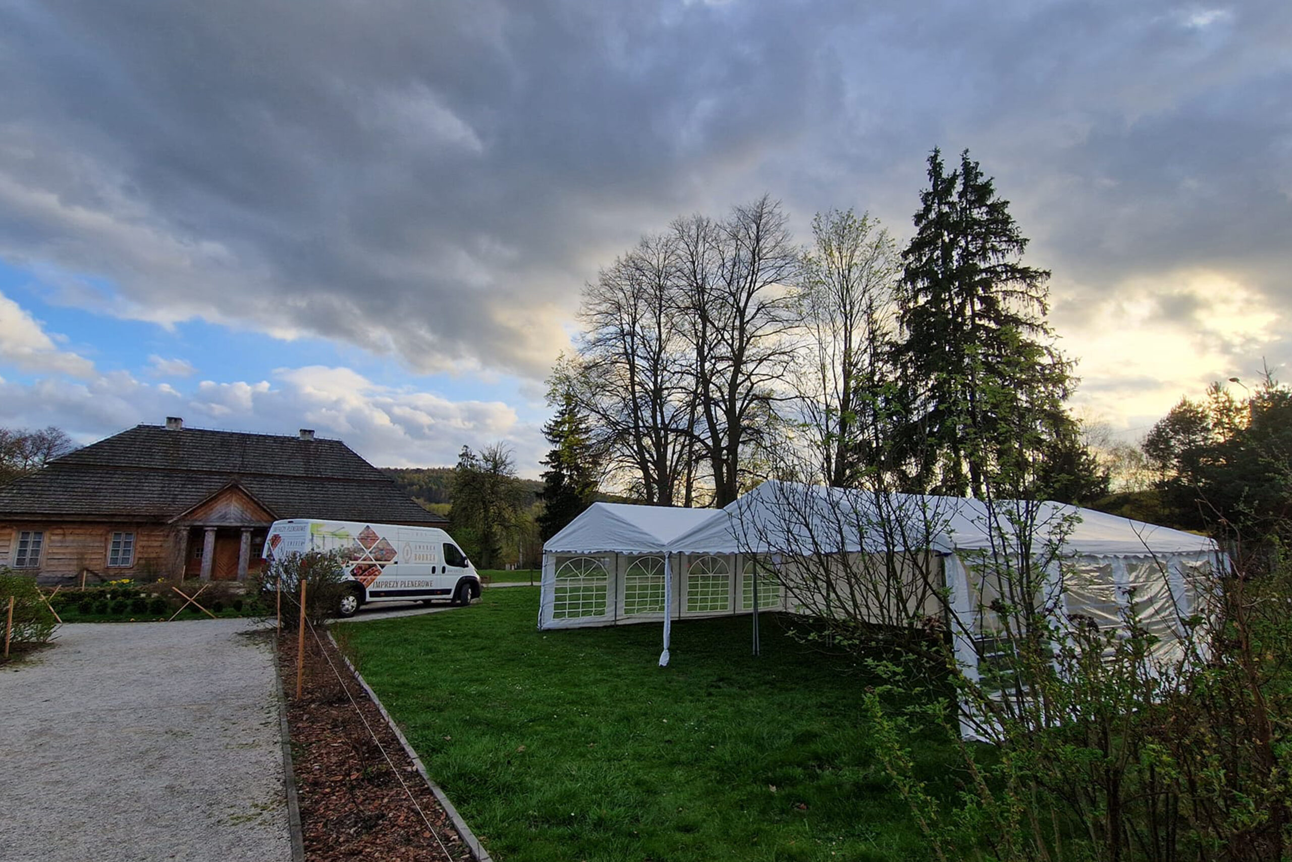 Bus Dworku Bobrza przy drewnianym dworku – kompleksowy wynajem namiotów plenerowych z montażem i transportem w Świętokrzyskiem